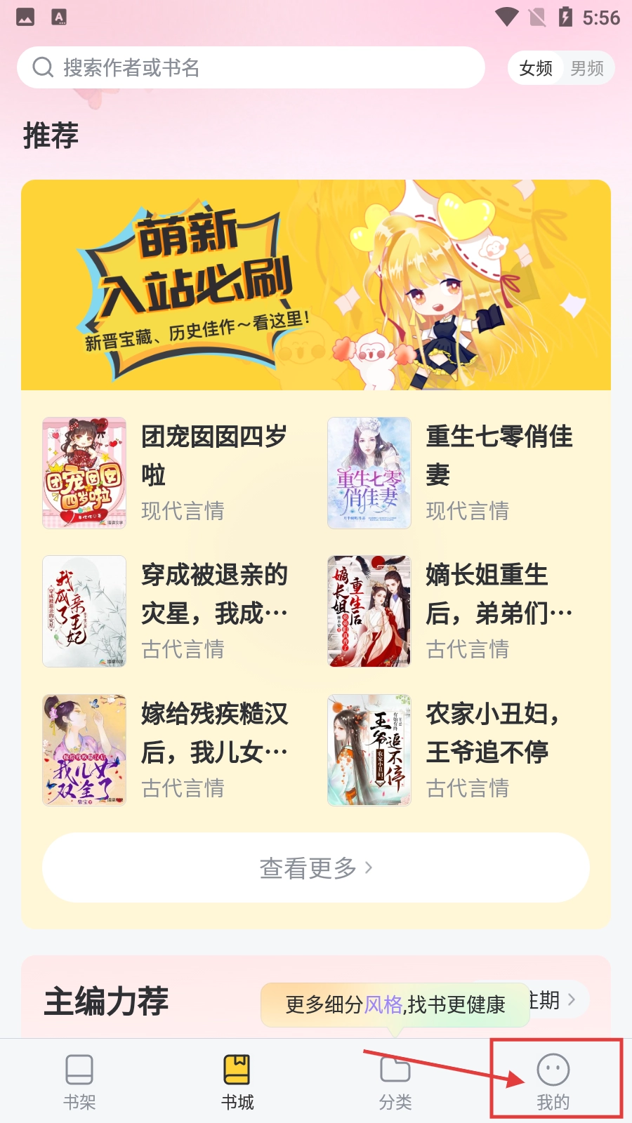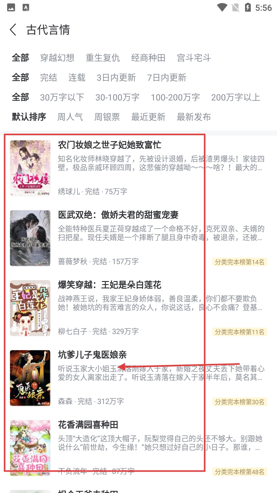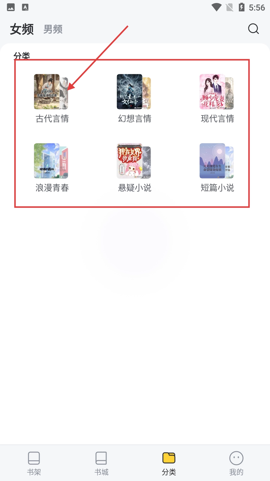 在分类页面,点击【古代言情】分类选项,即可进入古代言情小说的列表页面。