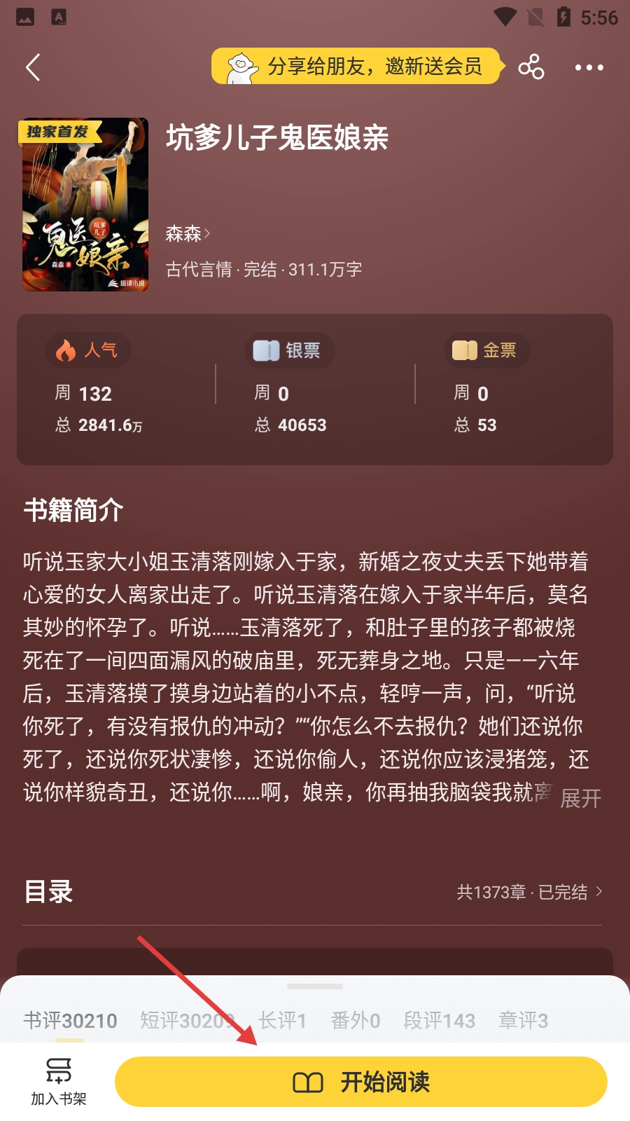 在古代言情小说的列表里,挑选自己感兴趣的作品,像《坑爹儿子鬼医娘亲》这类,然后点击进入该小说的详情页面。