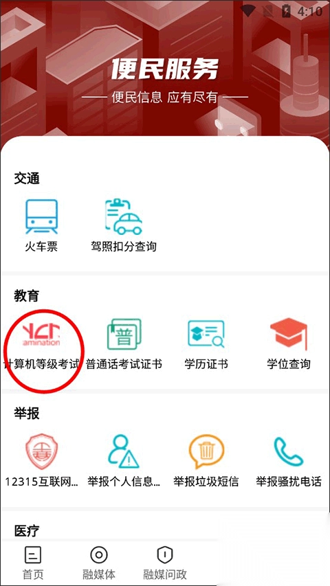 2. 在便民服务列表的教育类别里,找到计算机等级考试,随后点击该选项。