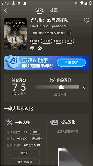 猫修app由知名汉化团队老猫倾力打造,它集游戏资讯、精品攻略、资源获取以及玩家交流等功能于一身,涵盖热门手游与电脑游戏的丰富内容。该软件独具匠心地设立了汉化游戏专区,在此独家发布海外游戏的中文版本,有效解决了国内玩家面临的语言障碍。其社区板块设有游戏修改技术讨论、实用工具共享等不同专区,大力支持用户分享资源、组队游戏或者参与各类互动,还有技术达人专注研究游戏修改技巧。