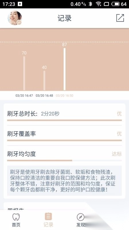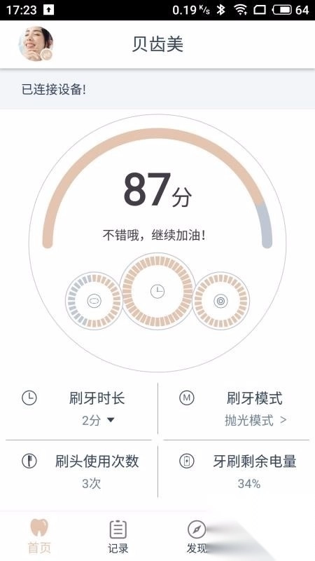 在首页,有详细的总评分,还包含刷牙时长、刷牙次数等信息。