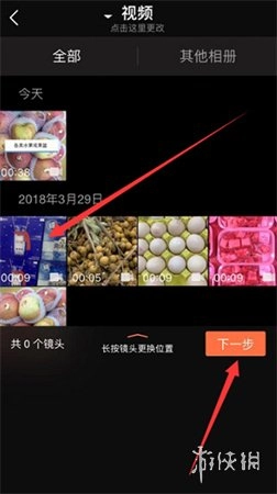 4、从相册中选择需要剪辑的视频素材,例如,小编这里有5个视频素材,点击要编辑的视频,然后点击“下一步”。