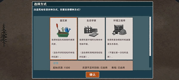 1当你踏入伊始之地,首先会播放一段动画,之后你能够从三种玩法模式中进行挑选,分别是园艺家、生态学家以及环境工程师。