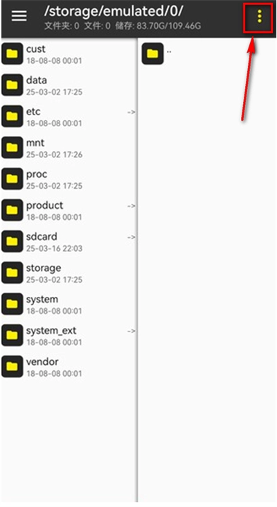 打开MT管理器粉色版的首页,轻点右上角的三个小点。