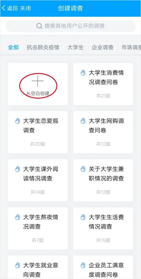 4、在创建调查页面点击从空白创建;