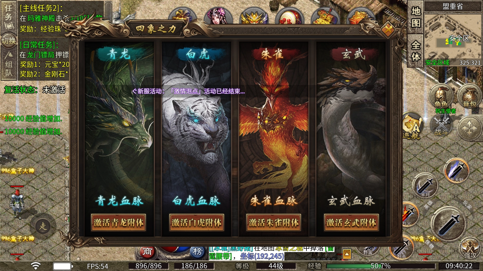 四象之力:消耗元宝即可激活青龙、白虎、朱雀、玄武四大神兽的力量,它们分别对应暴击、攻击伤害、PK增伤、PK减伤属性,可根据自身需求选择激活。