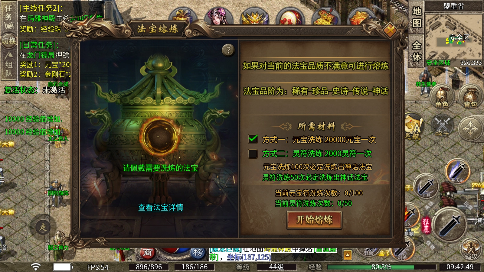 法宝洗练:可消耗元宝或者灵符对法宝进行洗练,如果对当前的法宝品质不满意可进行熔炼,法宝品阶为:稀有-珍品-史诗-传说-神话。