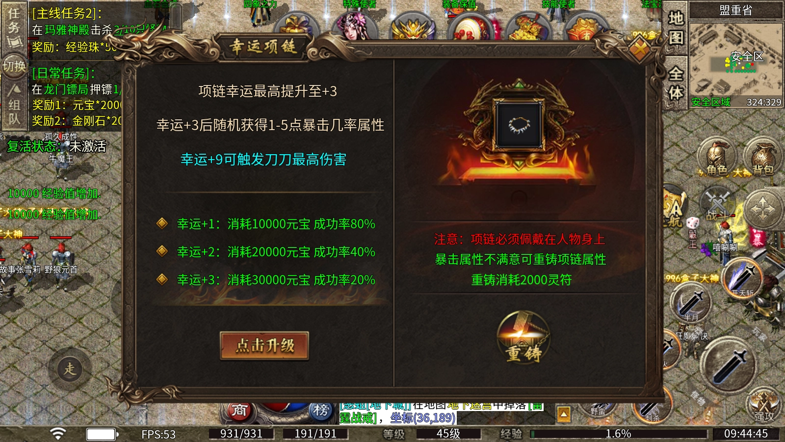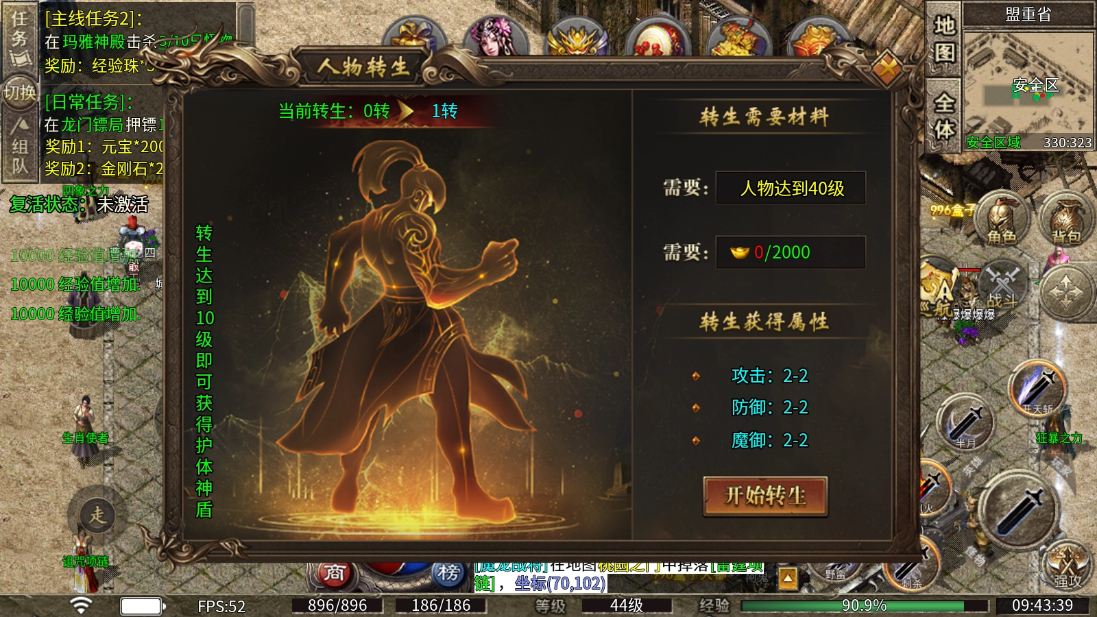 转生使者:人物等级到达40级后就能够消耗元宝转生,可以获得不错的属性,转生到达10级就能够获得护体神盾。