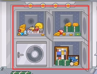 在银行二楼,你得打开一个保险柜。按照保险柜上的图形提示,找出对应的钻石、红心、星星和贝壳,再把它们依次放到正确的位置上。等完成这一步,保险柜就会打开,里面藏着不少宝物。