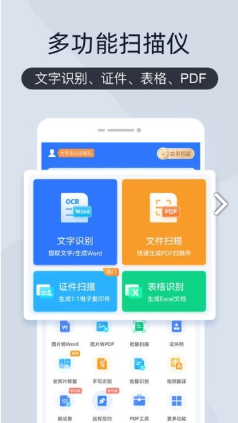 扫描王全能宝是一款能大幅减轻工作量的手机快速扫描工具。它可以通过拍照的方式,帮助用户扫描各类文字与文档;不仅能快速完成文字的扫描与识别,还支持在线编辑、翻译以及多种文件格式的转换,显著提升了工作和生活的效率!