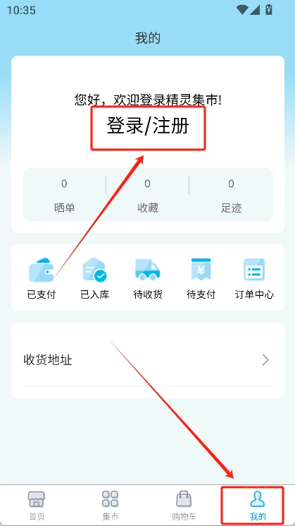 2、接着点击右下方的“我的”,随后点击“注册/登录”按钮,就能快速完成账号登录的操作了。