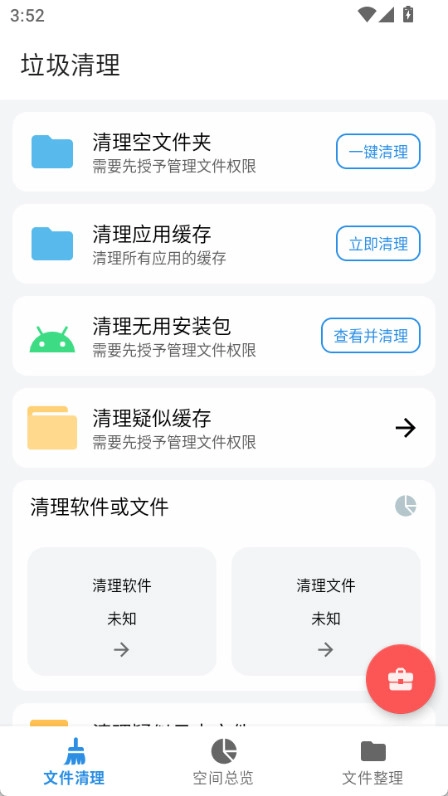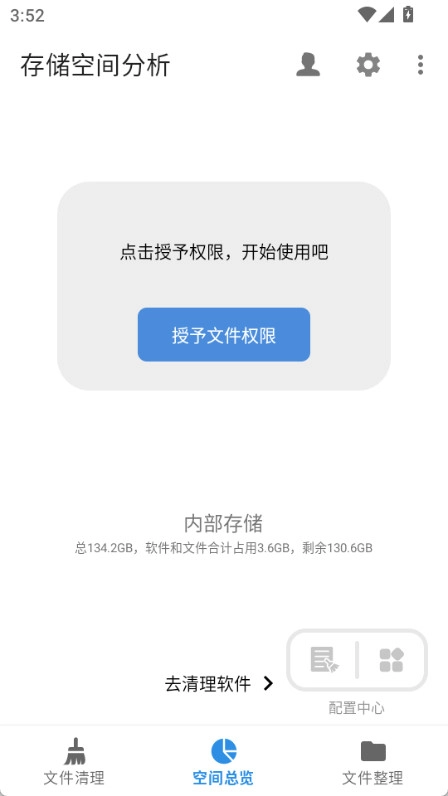 1. 安装XB清理器手机版后,打开应用进入空间总览页面,点击“授予文件权限”按钮。